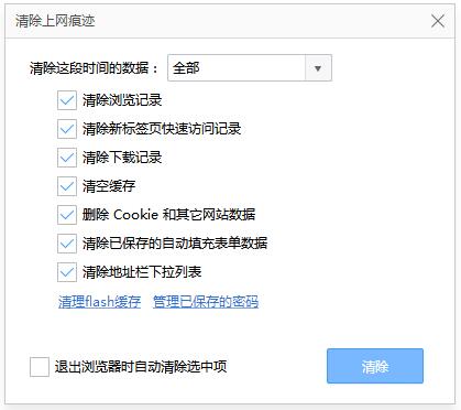 当程序做了更新后,有时候系统的部分功能无法使用,需要清除浏览器缓存,才可以正常使用。清除缓存,在浏览器设置—选项中,找到清除上网痕迹或清除历史记录,将时间段选择为全部,点击清除。也可以使用快捷键Ctrl + shift + delete 键,在弹框中直接清除上网痕迹。